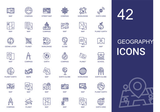 Set of 30 geography icon set. Includes gps, globe, earth, compass, crayon, planet, stone, and More. Outline icons vector collection.