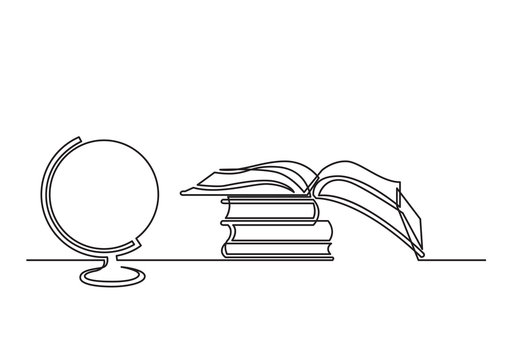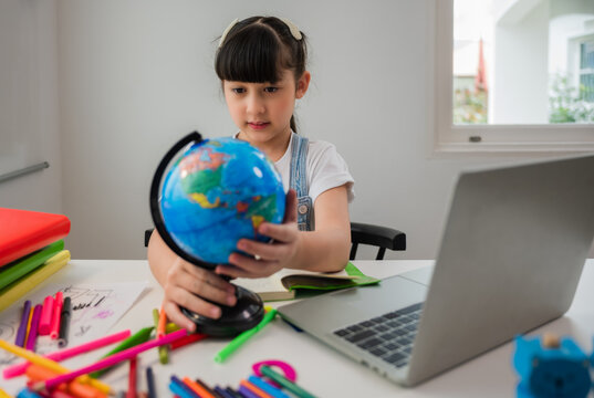Distance learning at home. Young student girl doing homework and preparing for online geography exam