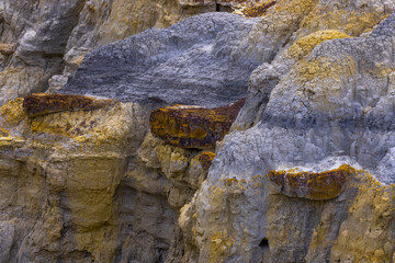 View of layered sedimentary rock formations displaying earthy hues and textures, revealing geological wonders in Shetpe, Mangystau Region, Kazakhstan.