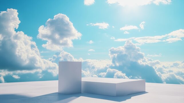 108.A contemporary outdoor-inspired scene with a geometric podium placed on a smooth surface, surrounded by a dynamic mix of sunny blue skies and puffy white clouds for a refreshing visual appeal.