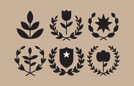 Collection of six black silhouette emblems featuring botanical elements and geometric shapes on a beige background