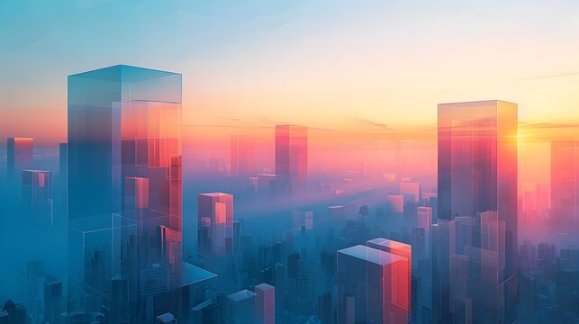 Minimalist Cityscape Sunrise with Geometric Skyscrapers and Vibrant Color Palette
