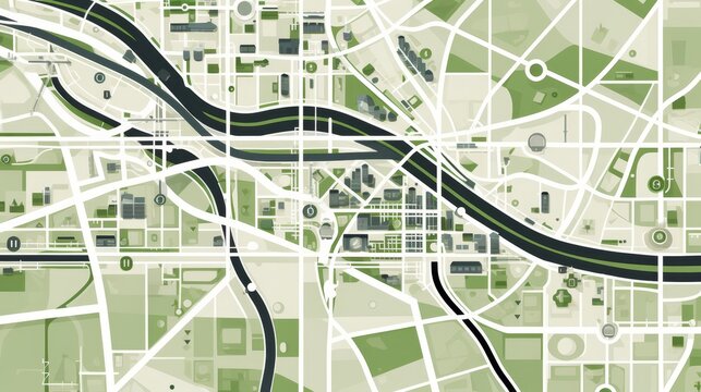 Minimalist geometric city map design featuring roads and areas in gray, green, and white tones