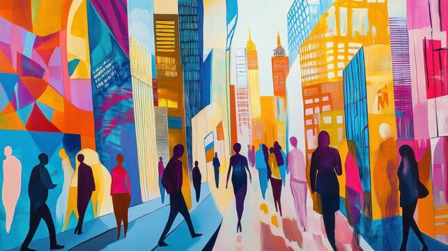 Vibrant city street scene with diverse people walking amidst colorful buildings and geometric shapes.