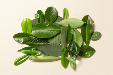 various leaves and clear liquid drops placed geometrically on skin tone background