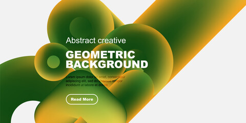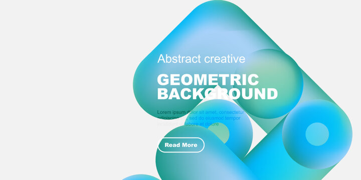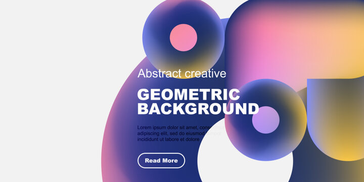 Abstract fluid shapes, vibrant colors, geometric design. Text includes geometric background, plus sample lorem ipsum text, button.