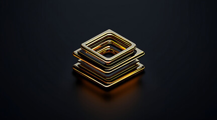 Golden stacked geometric rings, abstract metallic sculpture, reflective layers, luxury concept, dark background