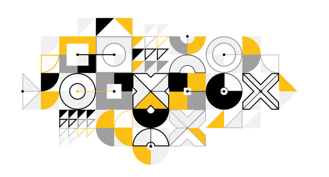 Abstract modern background in yellow colors and contemporary triangle square and block shapes layered in random geometric fan art pattern with fine texture