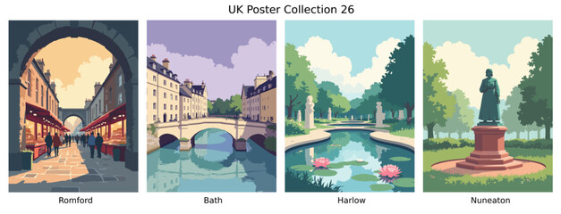 Romford, United Kingdom, Bath, United Kingdom, Harlow, United Kingdom, Nuneaton, United Kingdom Flat Vector Poster Collection