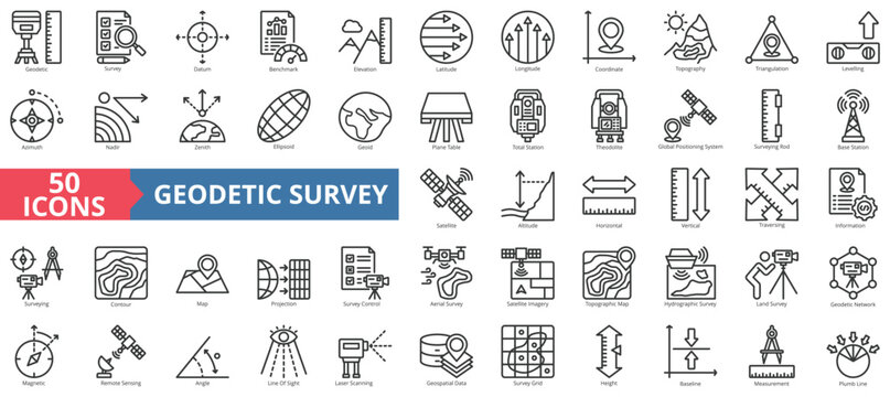 Geodetic survey icon collection set. Containing survey, datum, benchmark, elevation, latitude, longitude, coordinate, topography, azimuth, theodolite icon. Simple outline vector illustration.
