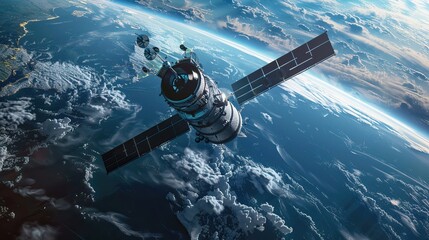 Satellite Orbiting Earth - A detailed of a satellite in orbit around planet Earth, showcasing its solar panels and the curvature of the Earth below
