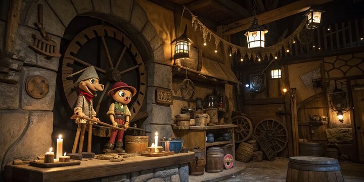 Enchanted Workshop of Geppetto: A Dimly Lit Scene of Woodworking with Intricate Puppet Designs and Tools, Illuminated by a Warm Glow of Lanterns and Candles