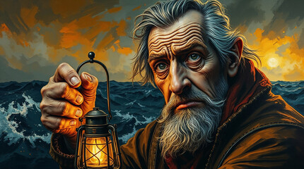 Old Man Geppetto Searching for Pinocchio with a Lamp on the Seashore at Night
