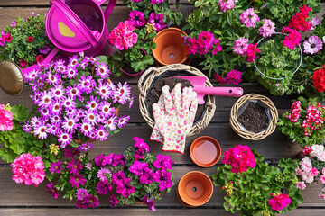 Various pink summer flowers cultivated in wicker baskets and terracottaflower pots