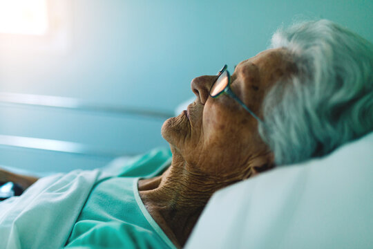 Hospital Ward: Portrait of Elderly Man Wearing Oxygen Mask Resting in Bed, Fully Recovering after Sickness and Successful Surgery. Old Man Remembering His Family, Friends, Happy Long Life
