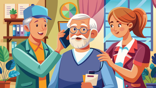 Senior old man and caring kind nurse, geriatric medicine caretaker helping with phone call for male nursing home resident, adult in assisted living, female doctor visiting patient