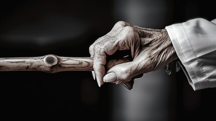 the hand of an older female patient holding a walking stick in a geriatric center or nursing home, conveying the challenges and care involved in managing this condition.