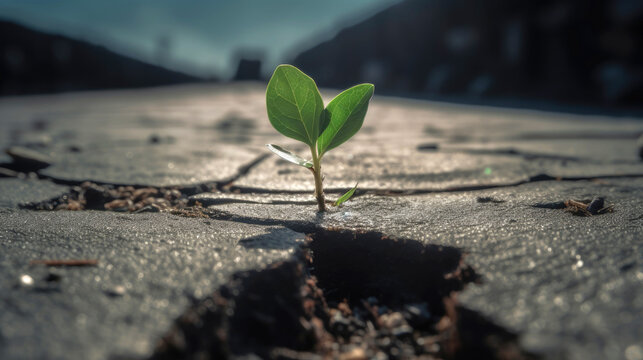 a small green sapling emerging from a crack in a asphalt surface. Generative AI