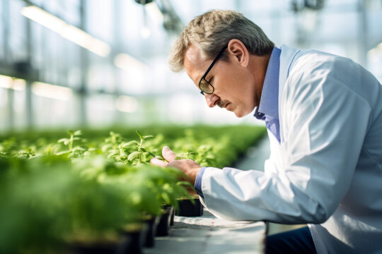 agricultural scientists researching plants and diseases in a greenhouse. Generative AI.