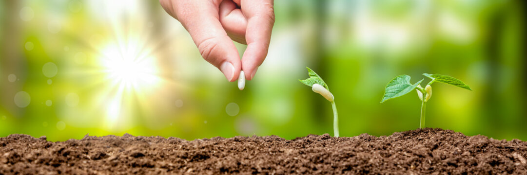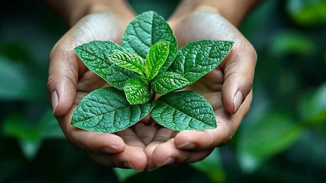 Hand hold green new plant in his hands. In palms of farmer, sprout in fertile land. Agriculture concept. Gardener on plantation plants sprouts into soil.