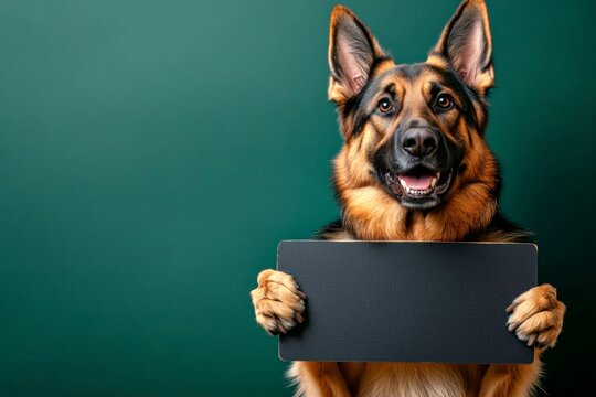 Minimalist ad creature. Isolated canine on a solid attire green background. Animal in clean mockup. Сute dog german shepherd hold in front paws a wireframe - large dark black way sign.