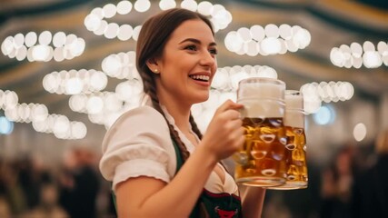 Smiling german woman in traditional attire dirndl dress holds two large beer mugs, surrounded by festive octoberfest decorations and warm lighting, celebrating joyful atmosphere of cultural festival