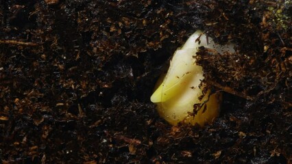 Corn seed is germinating and new green stem is appearing moving in soil filmed in timelapse. Macro footage of plant life cycle from small grain to young seedling. Rising vegetable in fertile soil