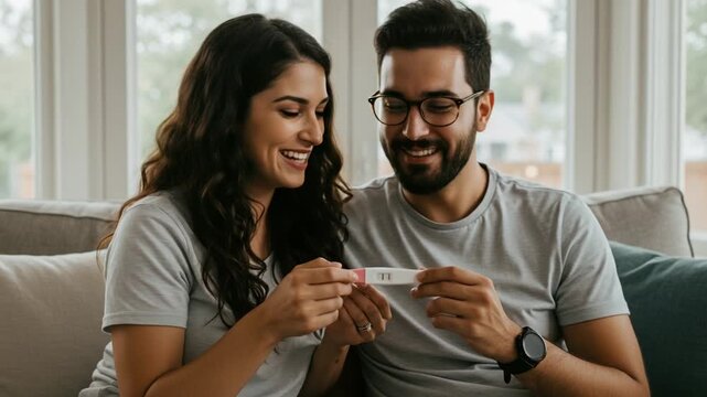 Excited young couple with positive pregnancy test looking forward to parenthood