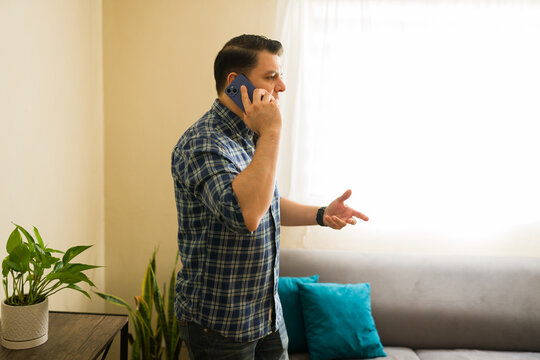 Hispanic man having serious phone conversation, disagreeing and gesticulating indoors, feeling frustrated or concerned