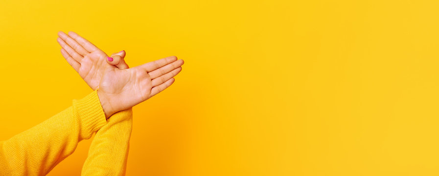 Hands gesture bird over yellow background , panoramic mock up image