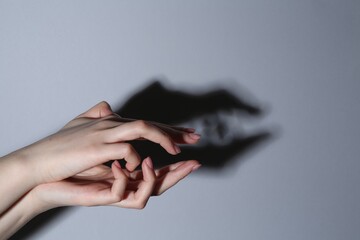 Shadow puppet. Woman making hand gesture like crocodile on grey background, closeup