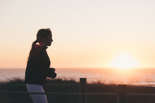 Healthy woman warms up before jogging and relaxes. Stretch your arms and look outside at the road, get in shape at the park before running and enjoy healthy outdoor activities.