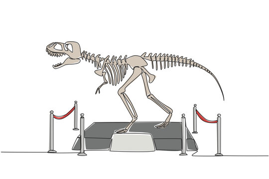 Single continuous line drawing T Rex dinosaur skeleton in museum room. Museum for learning. Get to know ancient animals. Dangerous animal. International Museum Day. One line design vector illustration