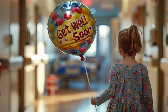 A young girl stands in a hospital corridor, holding a Get Well Soon balloon, symbolizing hope and care