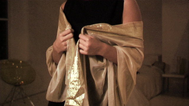 Woman getting dressed and putting shawl on