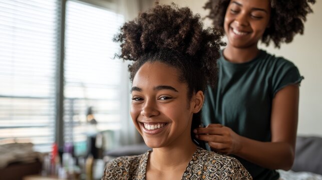Closeup of Black woman combing daughters hair, doing ponytail sitting on couch. Short-haired mother and little cute girl talking while spending time together on lazy weekend. Family, childhood concept