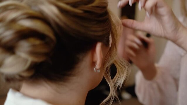 Close-up of a beautiful young bride getting her hair done and hanging her veil. morning preparations of the bride before the wedding ceremony. Hair close up