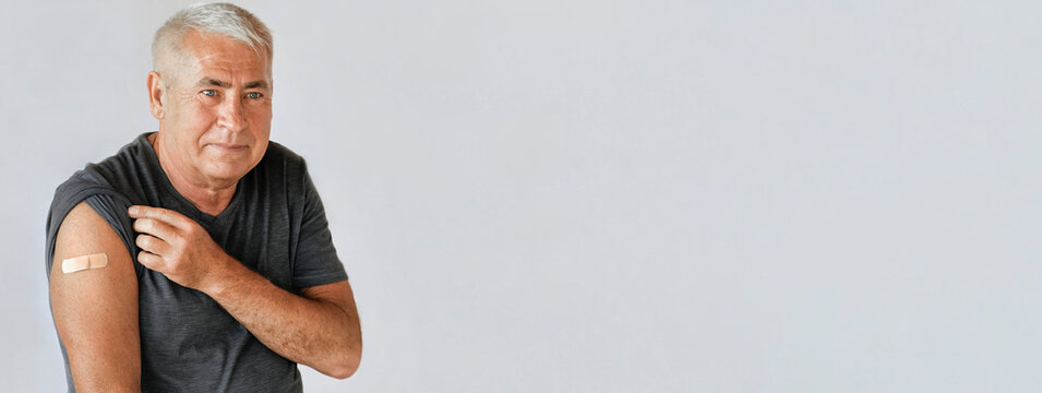 Male Senior Smiling after Receiving Vaccine. Old Man Showing Arm with Bandage, Patch after Vaccine from COVID-19 or Monkeypox. Covid, Monkey Pox Vaccination for Older People. Gray Studio Background.