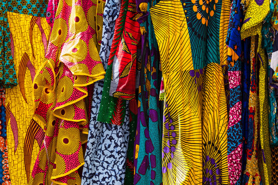 Smiling West African Woman in Vibrant Traditional Ghanaian Kente Cloth Dress, Adorned with Gold Jewelry, Standing in a Bustling Outdoor Village Market