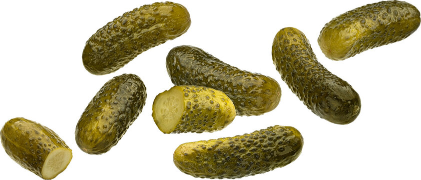 Pickles, Pickled gherkins, Preserved Marinated cucumbers vegetable, many angles and view front pile slice isolated on transparent cutout, PNG file. Mockup template for artwork graphic design