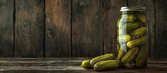 Homemade pickled gherkins in a glass jar mockup arranged on a wooden table background, showcasing fermented cucumbers with ample copy space image.