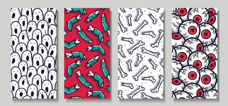 seamless pattern featuring classic Halloween symbols intertwined with autumn leaves.