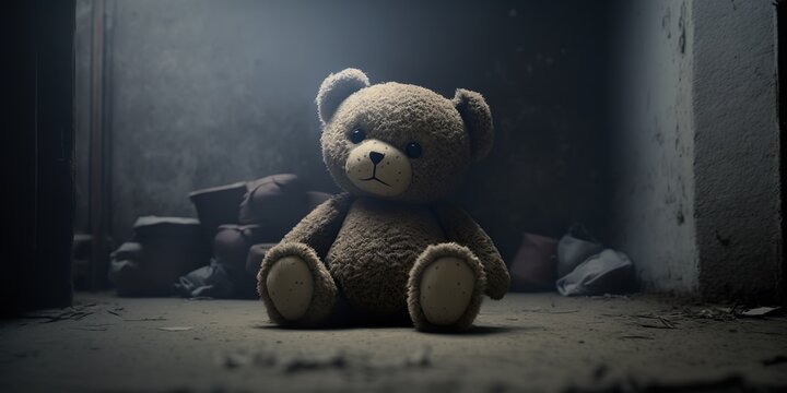 Childs toy or stuffed animal in dark eerie setting representing innocence of childhood in creepy or unsettling environment, created with Generative AI technology