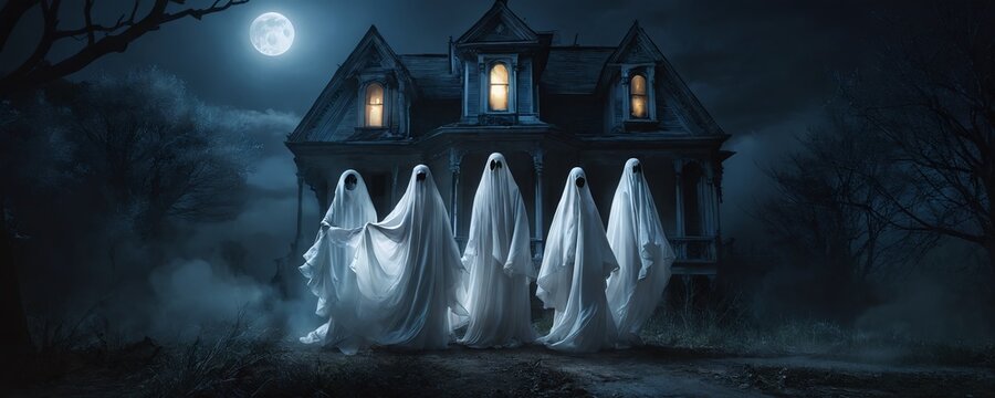 Eerie digital art of a ghostly gathering in a dark, atmospheric setting.