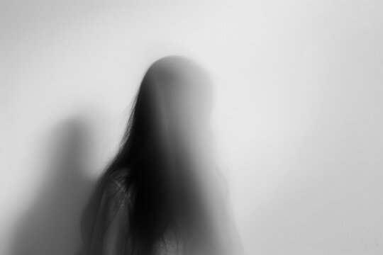A blurred silhouette of a woman in a dress stands on a beach at sunset, with the sun setting over the ocean.