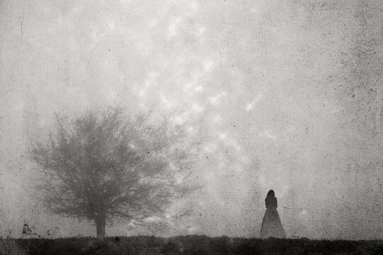 Ghostly silhouette of a faceless female ghost entity, paranormal haunting woodlands apparition wearing a white translucent robe, spirit of the forest, motion blurred - generative AI