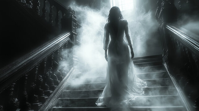 Ghostly woman on the stairs, shrouded in fog and mist, wearing a long white dress in a Victorian style. A horror movie scene. Cinematic lighting. Hyper-realistic photography.