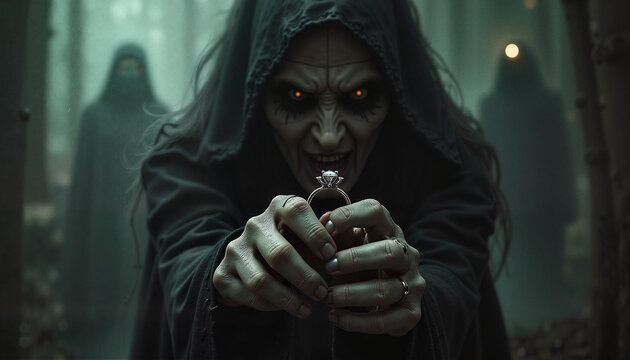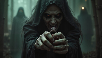 Mystical hooded figure seated in a shadowy, artistic composition.