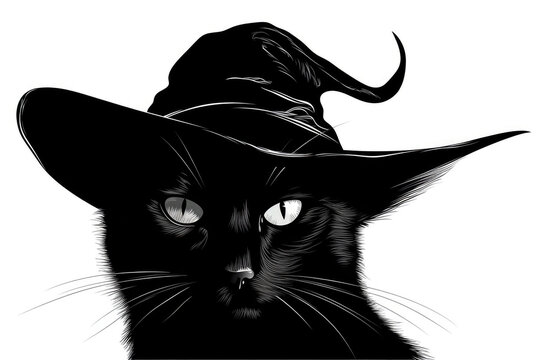 Silhouette Of Cat In Cap On White Background, Halloween. Generative AI
