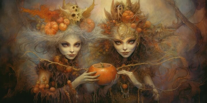 AI generated illustration of a vibrant watercolor of two witches in a spooky Halloween scene